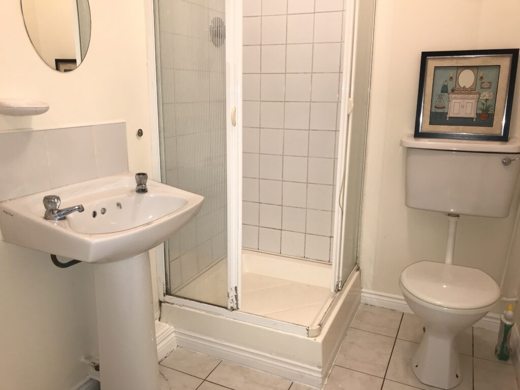 2m (6’7″) x 1.58m (5’2″) Tiled shower stall with mains water shower, w.h.b. with shaver light and splashback tiles, w.c and ceramic floor tiles.